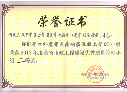 “管口外壁帶毛痕鋼筋混凝土管”QC小組榮獲2013年度全省市政工程建設(shè)優(yōu)秀質(zhì)量管理小組二等獎