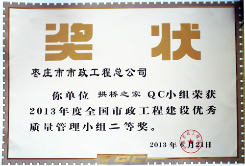 “拱橋之家”QC小組榮獲2013年度全國市政工程建設(shè)優(yōu)秀質(zhì)量管理小組二等獎(jiǎng)
