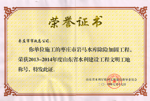 “棗莊市巖馬水庫除險(xiǎn)加固工程”榮獲2013—2014年度山東省水利建設(shè)工程文明工地稱號(hào)