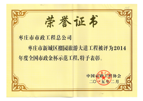“棗莊市新城區(qū)榴園旅游大道工程”被評(píng)為2014年度全國(guó)市政金杯示范工程